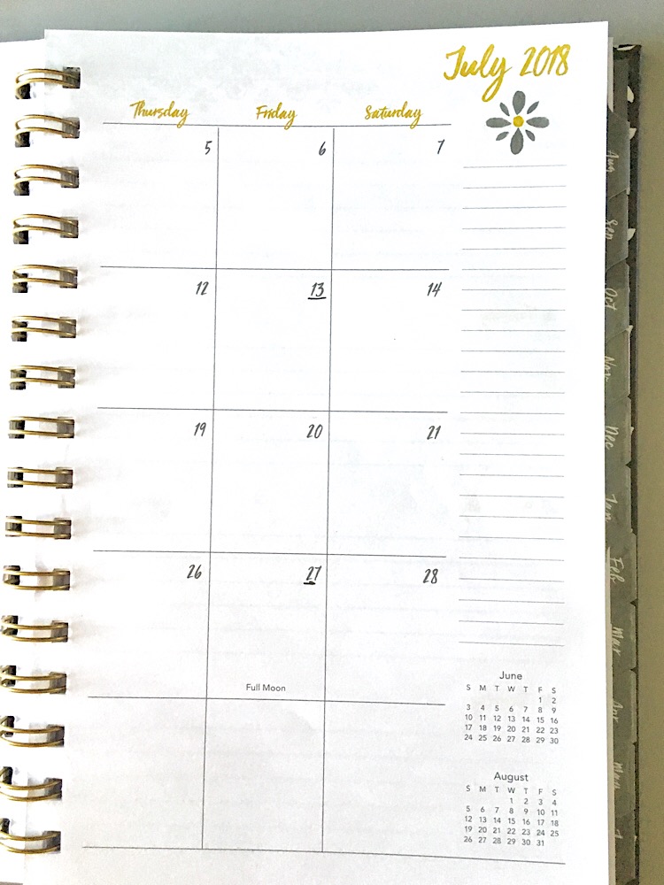 What’s not so great: Its made of regular paper so it is subject to spills, rips, and tears. It’s not invincible against the elements. The spiral binding is bound to get snagged in my bag like the rest of my spiral bound books so I expect to spend time squeezing the wire together and re-threading pages before the year ends. There are no pockets for additional papers. There is no clasp or elastic to secure the calendar shut, leaving it vulnerable to bent pages. Oh no! Did I just say bent pages?! It’s a one-time-use weekly planner calendar so at the end of June 2019 I’ll have to buy another. Bummer.